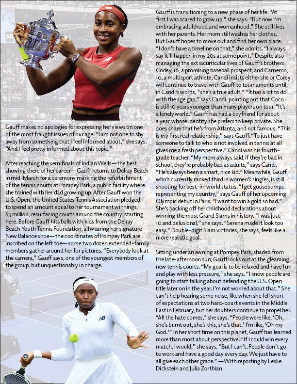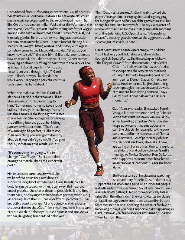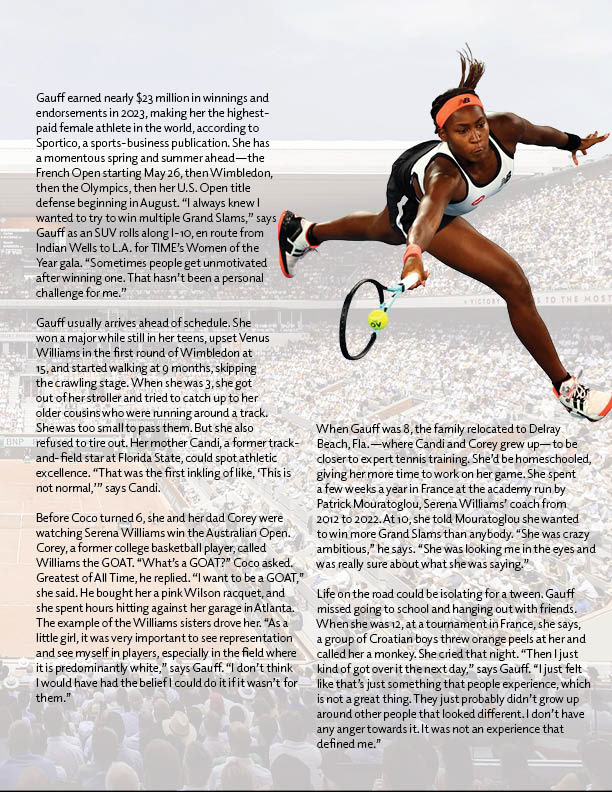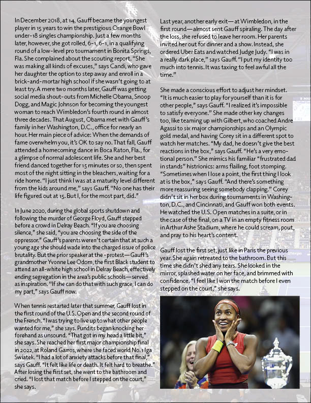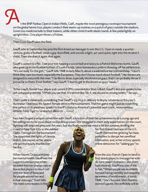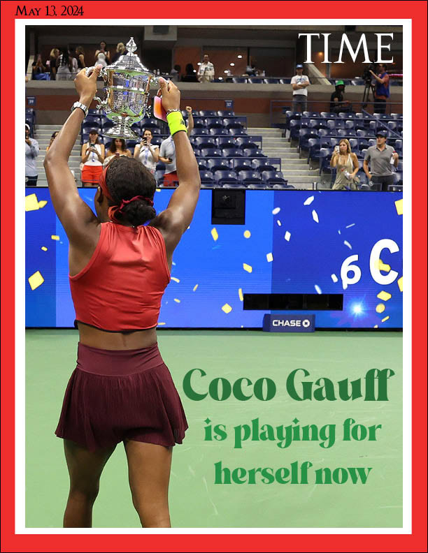In my graphic design class we had to redesign a magazine from a popular news source. I chose the TIME magazine of Coco Gauff. I chose to have her holding the US Open trophy as the cover page, and stuck with the iconic TIME red outline. I put different courts as the background of each page. The courts are from the major tournaments, Roland Garros, US Open, and the Australian Open. I added a lot of pictures of her to random spots to have the text wrapped around.