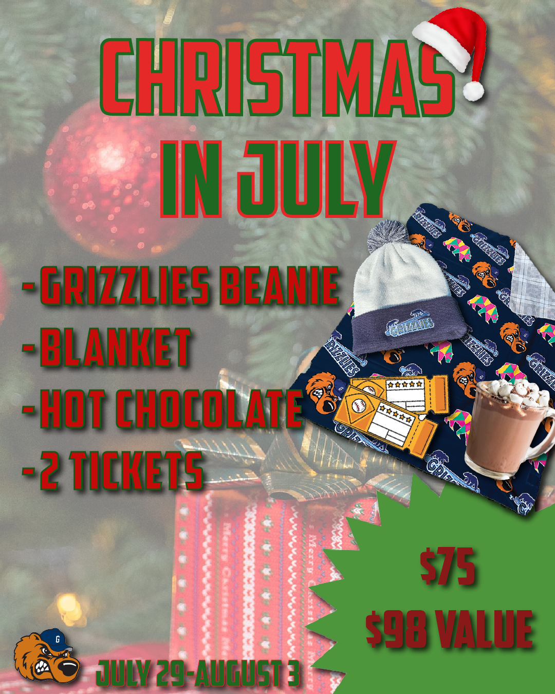 While working for the Gateway Grizzlies one of my main jobs was to create ticket bundles. Ticket bundles include 2 tickets and then some merch and food. I had to look through the store to see what we had in stock and then add it to the bundle, it was then my job to create a graphic that promoted those bundles. I had to stay in branding guidelines, and include all information. I also did this for the 4th of July weekend when we were selling a lot of themed merch.